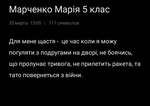 Учні 5 класу разом з учителем української мови Наталією Анатоліївною Андросенко взяли участь у цікавому творчому завданні – написали свої роздуми про щастя та опублікували їх у Facebook. Кожен з них поділився тим, що для нього означає це відчуття: дехто вважає щастям родинне тепло, інші – можливість займатися улюбленою справою, а хтось – щасливі моменти проведені в колі рідних та друзів.